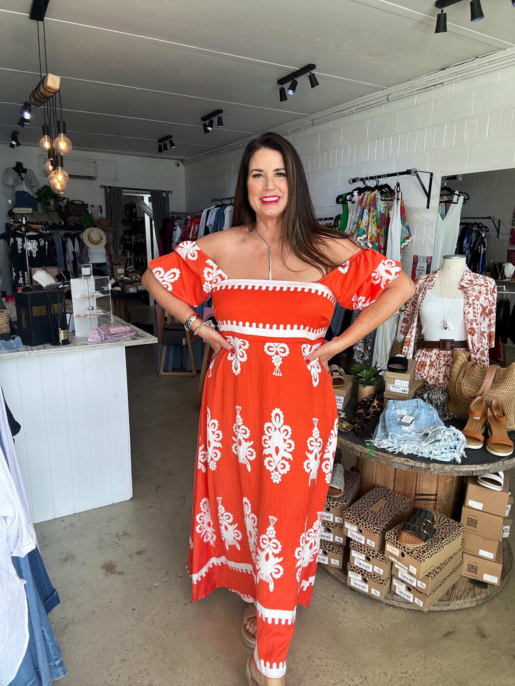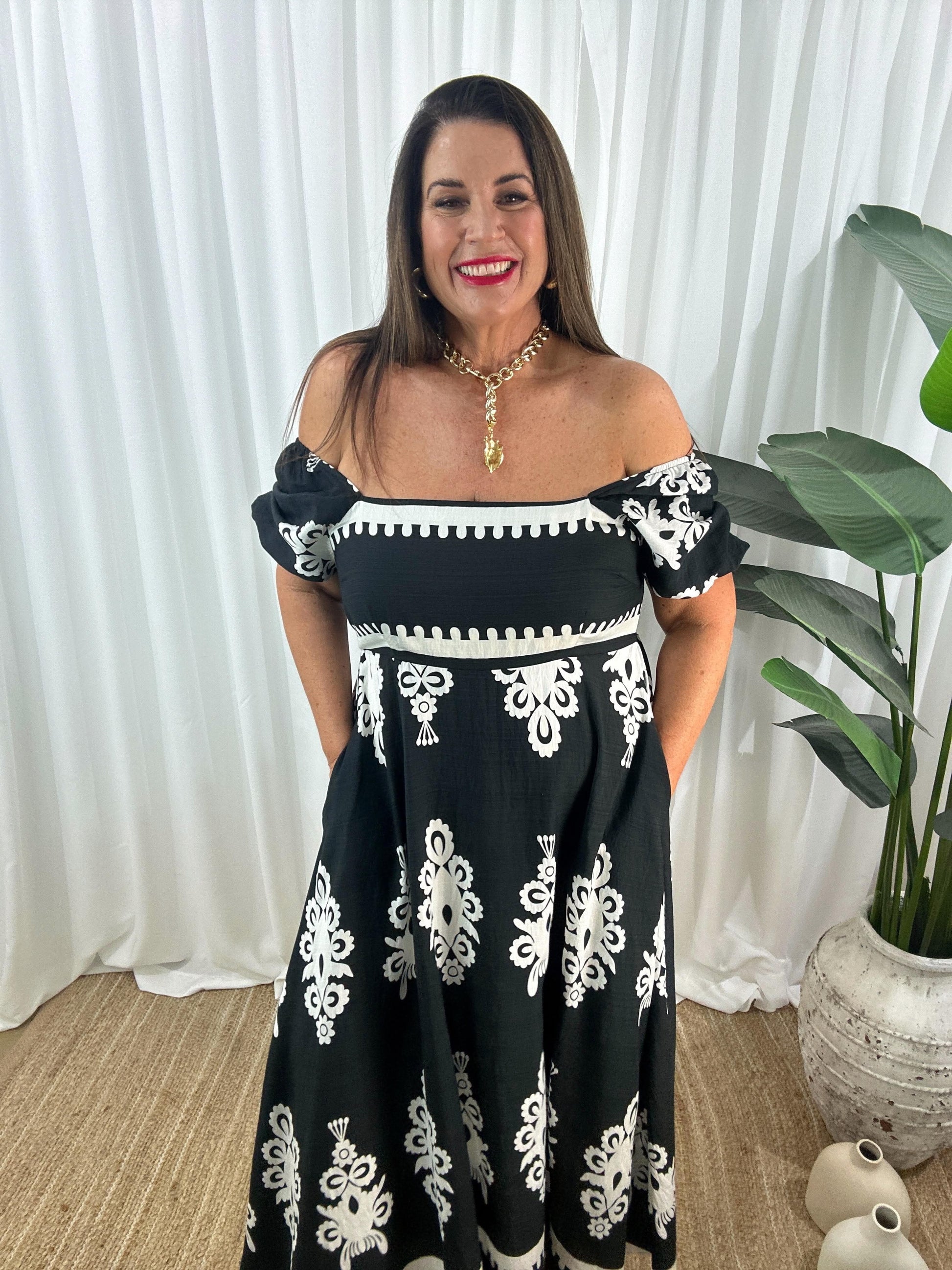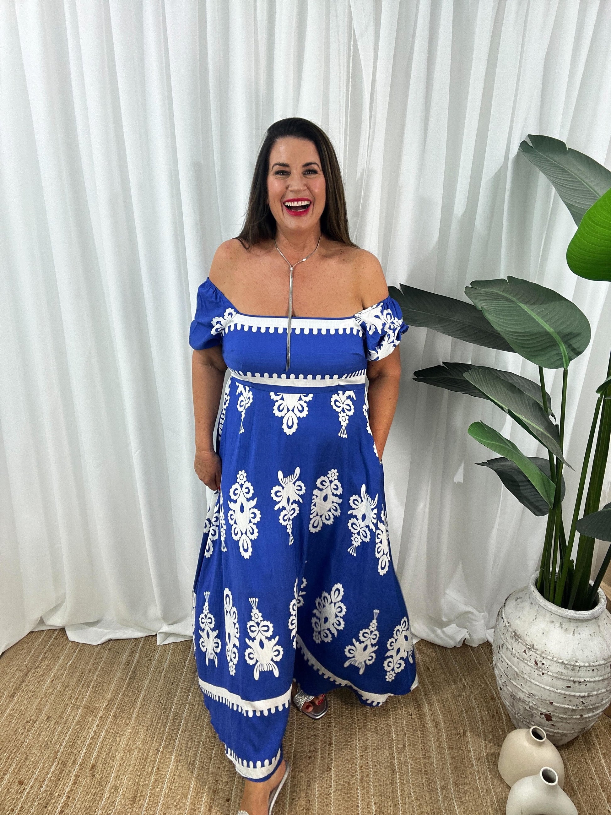 Upptäck din nya favorit: Axelbandslös Maxiklänning med Kort Ärm! Denna luftiga och mönstrade maxiklänning från Eva Jansson kombinerar komfort med stil. Perfekt för varma dagar och sommarkvällar.