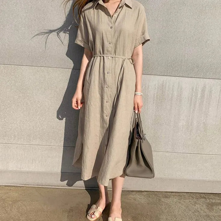 Midiklänning med knappar för kvinnor - Kortärmad - Bälte i midjan