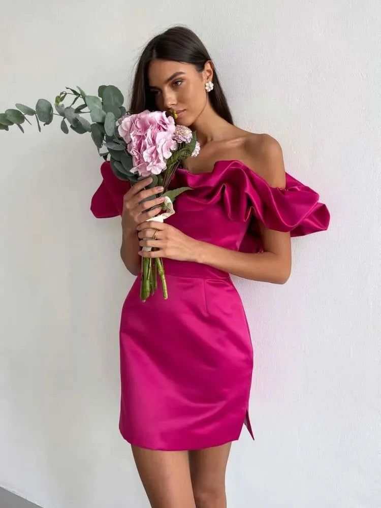 Dra till dig uppmärksamhet med denna eleganta off-shoulder-miniklänning med dramatiska volangdetaljer längs halsringningen och ärmarna. Dess figursmickrande passform och snygga silhuett gör den perfekt för speciella tillfällen eller eleganta kvällar ute. Ett tidlöst val för kvinnor som älskar en djärv men sofistikerad look.