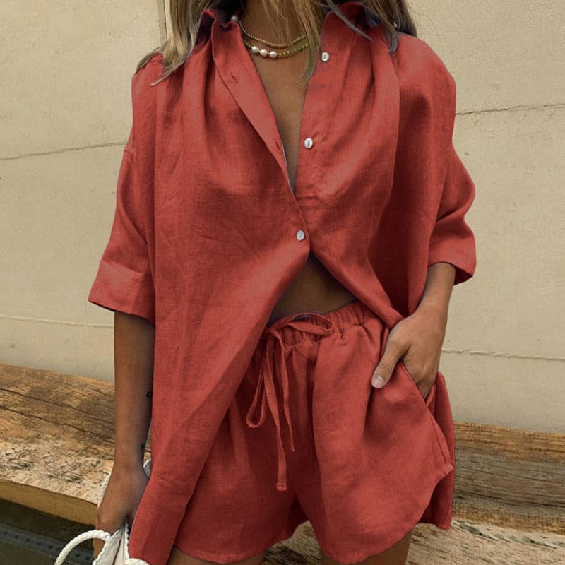 Damtvådelat Set – Oversize Skjorta & Högmidjade Shorts – Luftigt Linne – Avslappnad Passform