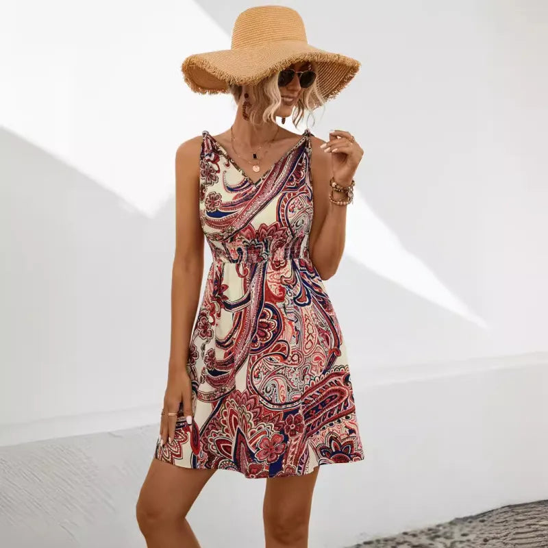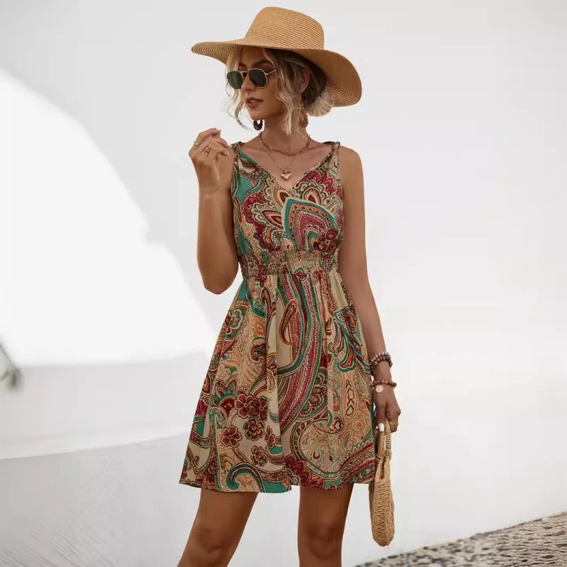 Omfamna elegansen med denna livfulla paisleymönstrade klänning, designad för soliga dagar och sofistikerade kvällar. Dess smickrande omlott-V-ringning och ärmlösa skärning erbjuder både komfort och lockelse, vilket gör den till ett måste i din sommargarderob.